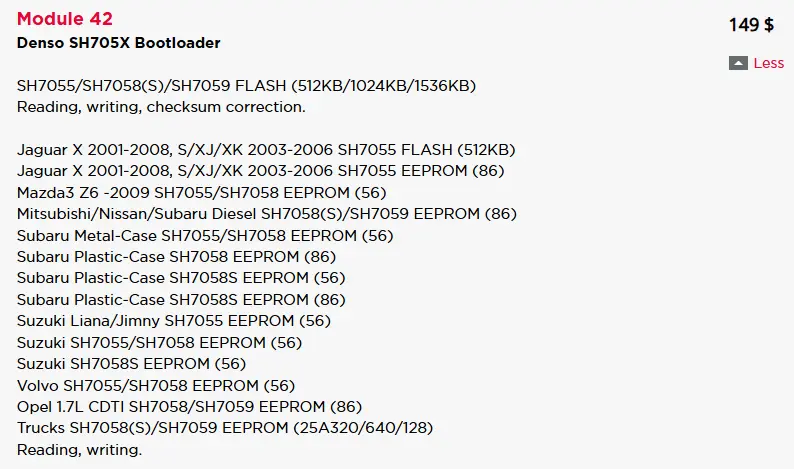 - Nissan ECUs, including Hitachi SH705x and some newer Continental units.